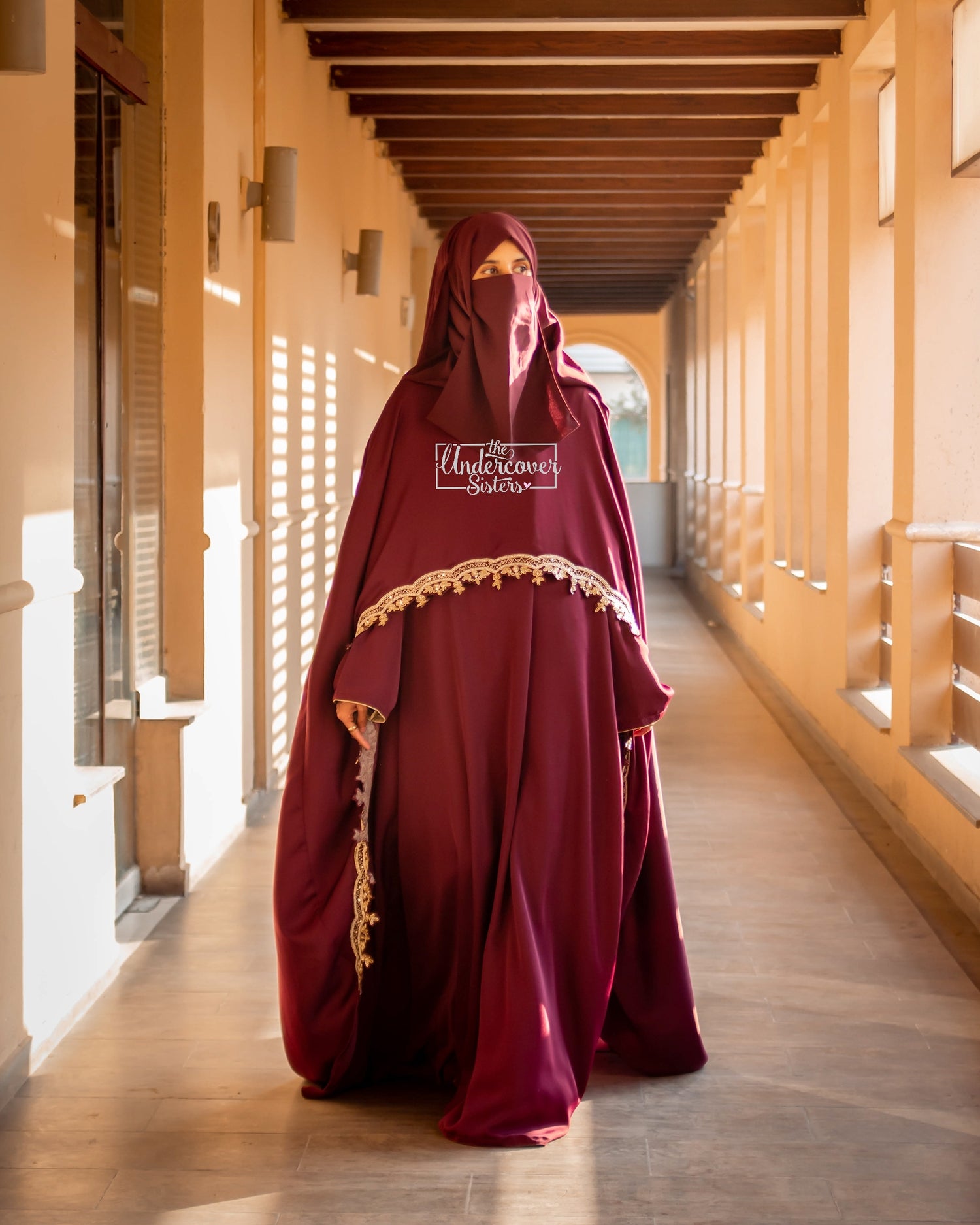 Crafted for refined elegance, the *Elan Veil* is a luxurious modest wear piece designed to captivate. Meticulously made with *yards upon yards of premium Nida fabric*, it creates a *majestic trail and fluid, dreamy fall* that adds drama and grace to every step.
