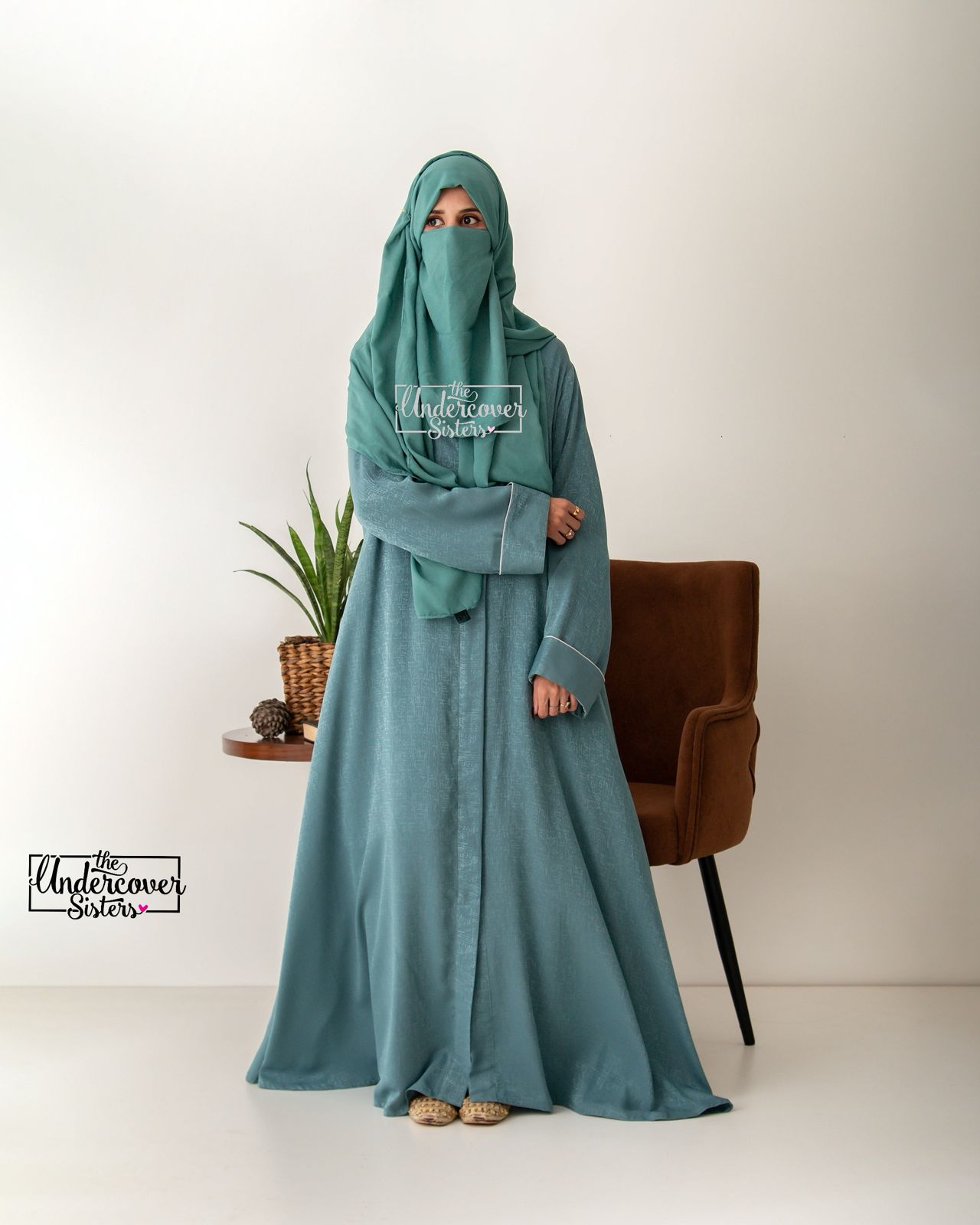 This stunning modest dress in teal exudes timeless elegance. The flowing fabric drapes gracefully, offering a soft and lightweight feel perfect for special occasions or evening wear.
