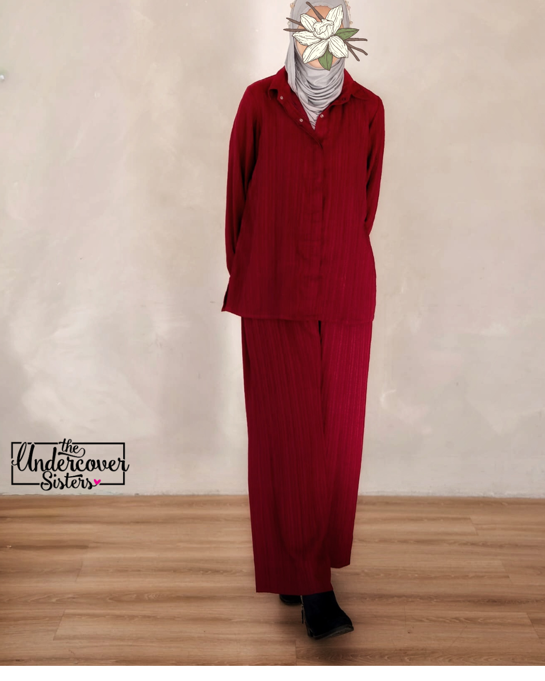Elevate your everyday style with this chic coord set featuring a smart collar neck and front-open short shirt, paired with wide-leg trousers for a modest yet modern silhouette. Designed for both comfort and elegance, this set is perfect for casual outings or dressed-up occasions.