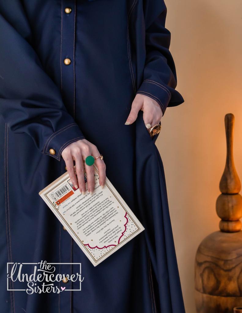 This timeless classic abaya is a must have for every Coat lover Hijabi out there. In Dark navy hues with contrasting thread detailing, and smart vintage buttons! This is a must have for your winter wardrobe!